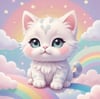 It sits among fluffy clouds against a dreamy background of soft pastel colors, twinkling stars, and gentle rainbows in a simple yet adorable style.