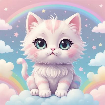 A charming and cute kawaii cat is depicted with large shiny eyes, pastel fur, and small paws.